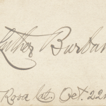 Expressive autograph by one of the leading lights in American science, Luther Burbank. Signed in Santa Rosa, California, on October 22, 1919. On 2.5″ x 4″ card, in brown fountain...